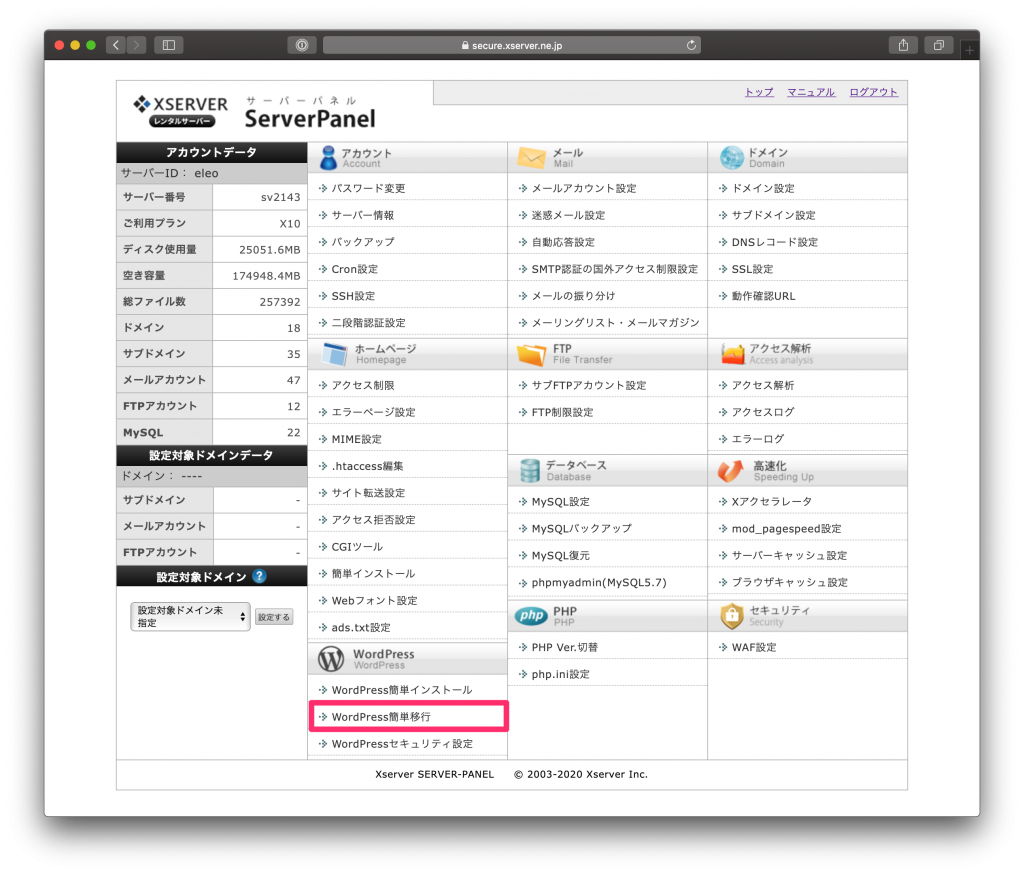- エックスサーバー管理画面より、”WordPress簡単移行”メニューへ移動する。