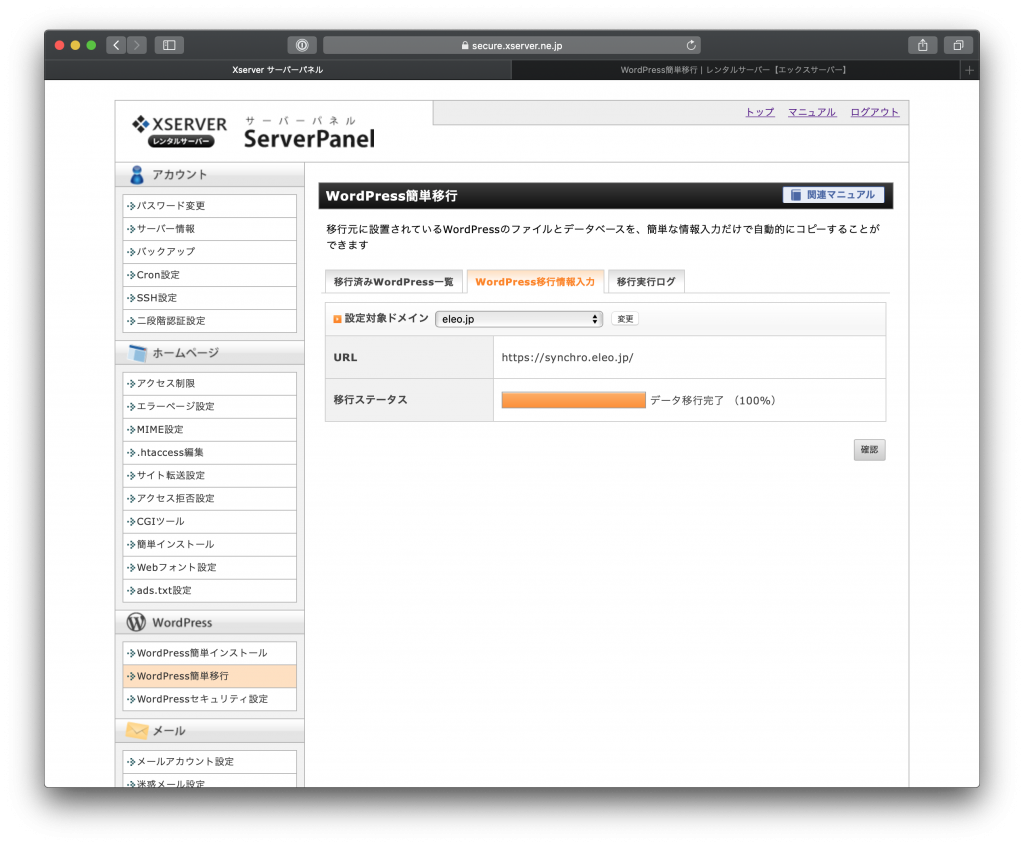 - しばらくしてデータ移行完了100%となったら、確認ボタンをクリックする。
